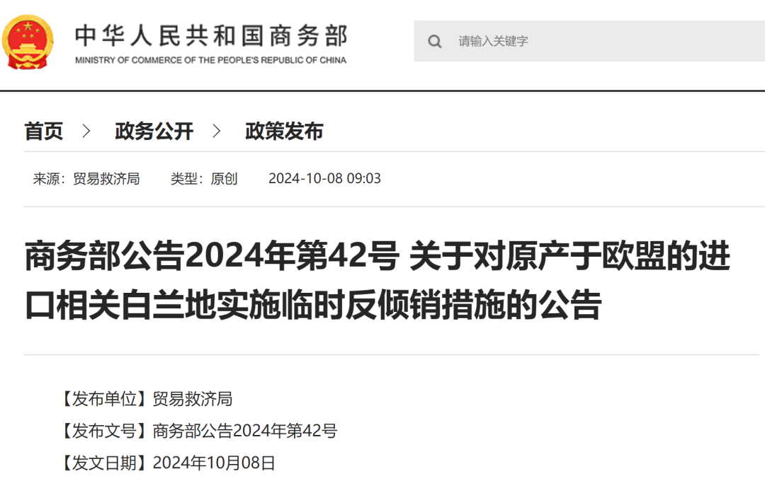根据《中华人民共和国反倾销条例》(以下称《反倾销条例》)的规定和有关调查结果,2024年8月29日,商务部(以下称调查机关)发布2024年第35号公告,初步认定原产于欧盟的进口相关白兰地存在倾销,国内相关白兰地产业受到实质损害威胁,而且倾销与实质损害威胁之间存在因果关系。