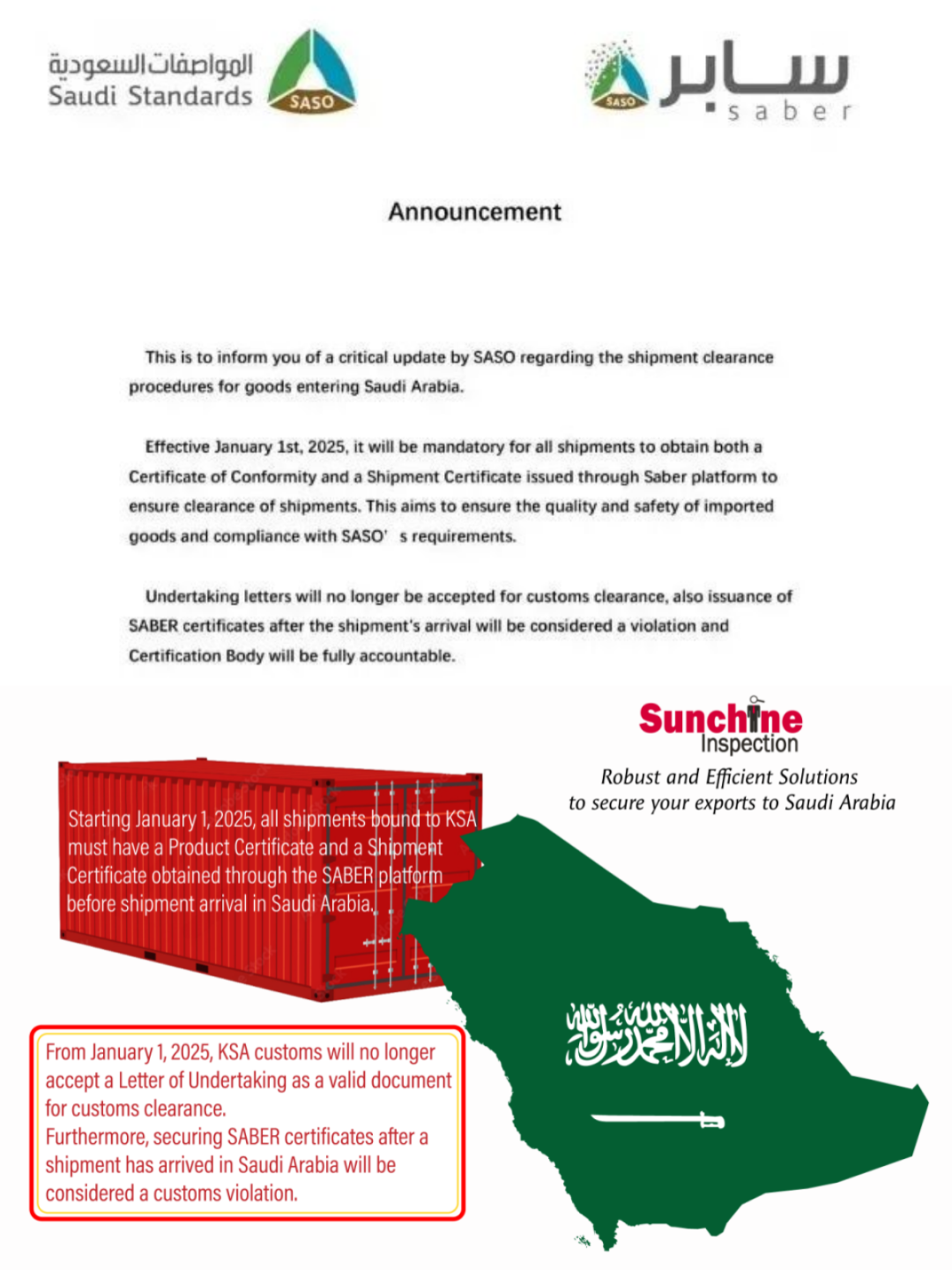 SABER认证是沙特阿拉伯的强制性产品认证制度,对于想要在沙特市场上销售的产品来说,获得SABER认证是必要条件。新规的实施,意味着原有的承诺函(Undertaking letters)将不再适用于清关过程,而到港后申请的SC证书也将被视为无效,这将直接导致货物无法清关,进而可能产生罚款、滞留费或滞期费等额外费用,这些费用或将由进口商全部承担。